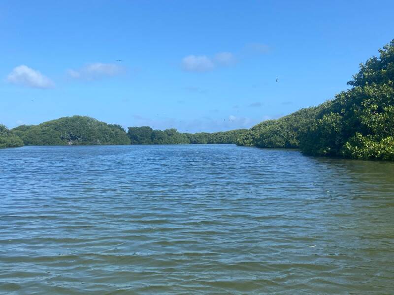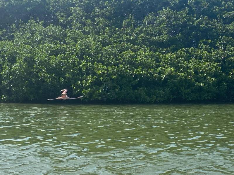 Guidés par cette atmosphère enchanteresse, nous mettons rapidement l’annexe à l’eau et entreprenons une exploration de la mangrove. Immense et préservée dans toute sa magnificence naturelle, elle nous enveloppe dans son mystère. Des milliers d’oiseaux y ont élu domicile, et parmi eux, un flamant rose apparaît comme un trésor aux couleurs vives. Au fil des kilomètres parcourus dans cette jungle aquatique, nous nous laissons hypnotiser par le silence vibrant de la vie qui nous entoure. Naviguer lentement dans ce sanctuaire primitif, tout en veillant à ne pas troubler la sérénité de ses habitants, est une expérience envoûtante. Ici, la peur semble être une notion inconnue.