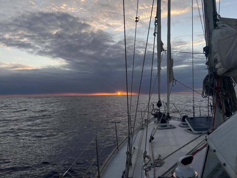 Lever du soleil sur l’arrière, coucher sur l’avant de DUO… Un rituel quotidien que nous ne manquons sous aucun prétexte. Chaque matin, chaque soir, le ciel nous offre un spectacle unique. Aucun ne se ressemble, et pourtant tous nous émerveillent. Des instants suspendus, entre lumière dorée et silence d’océan, qui nous rappellent combien il est précieux d’être là, simplement.