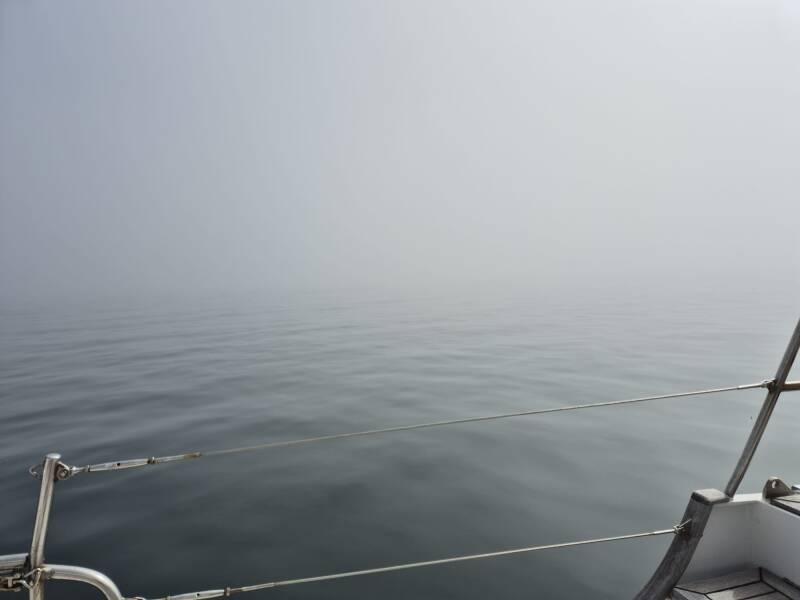 De tocht van Muxía naar Fisterra verliep zonder problemen, maar opnieuw zonder wind en met een dikke mist die ons de hele dag omhulde. Dus voeren we op de motor. Op 1,5 mijl van de kust konden we nog steeds niets zien, dus naderden we de kaap Finisterre op de radar, om de ondieptes te vermijden. Net toen we de kaap passeerden, trok de mist plotseling even op en kregen we een adembenemend zicht op de vuurtoren van Fisterra, hoog op zijn klif tronend. Het was een onvergetelijk moment, puur en majestueus.