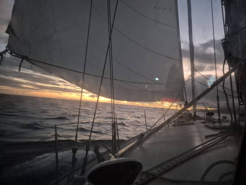 Départ de Gran Tarajal au coucher du soleil. Belle nuit de navigation avec 15 nœuds de vent de travers. DUO glisse à 6,5–7 nœuds vers Gran Canaria.
