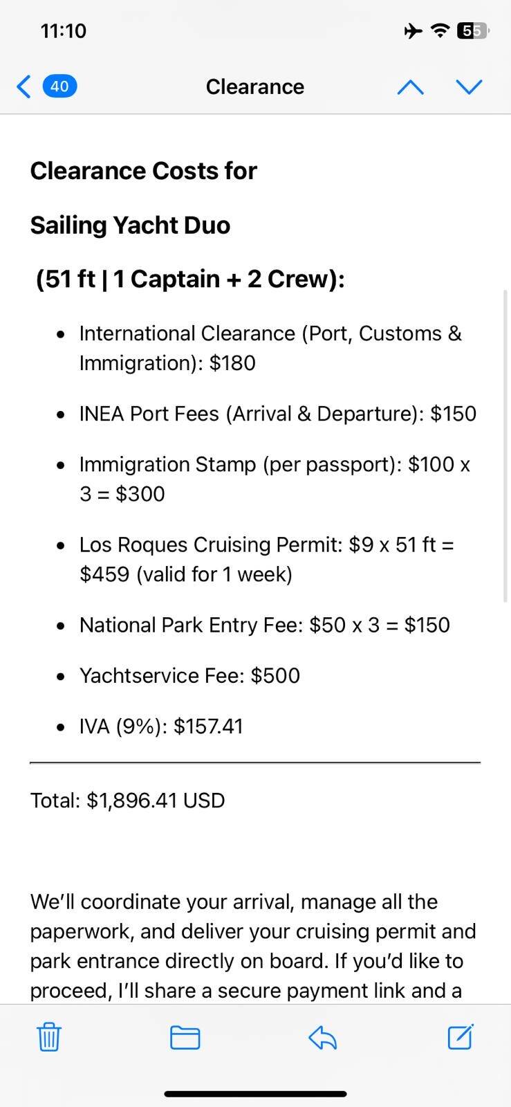 De keuze was snel gemaakt: we moesten onze reis voortzetten zonder halt te houden, genietend van de schoonheid van de Roques vanaf de horizon zonder daadwerkelijk het anker te laten vallen. Hieronder vindt u de antwoordmail van de lokale autoriteiten, waarin alle kosten staan vermeld die moeten worden betaald om aan te kunnen meren bij de Roques. Zonder twijfel een prachtige bestemming, maar eentje die een fors budget vraagt!